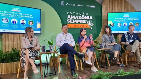 La directora de Cooperación Sectorial, Europea y Multilateral, Mónica Corrales, en el evento de lanzamiento de la publicación “Amazonía: Un viaje hacia la prosperidad y la resiliencia”. 14 de noviembre de 2025, en la Estación AMAZÔNIA SEMPRE del Museo Goeldi, Belém, Brasil.