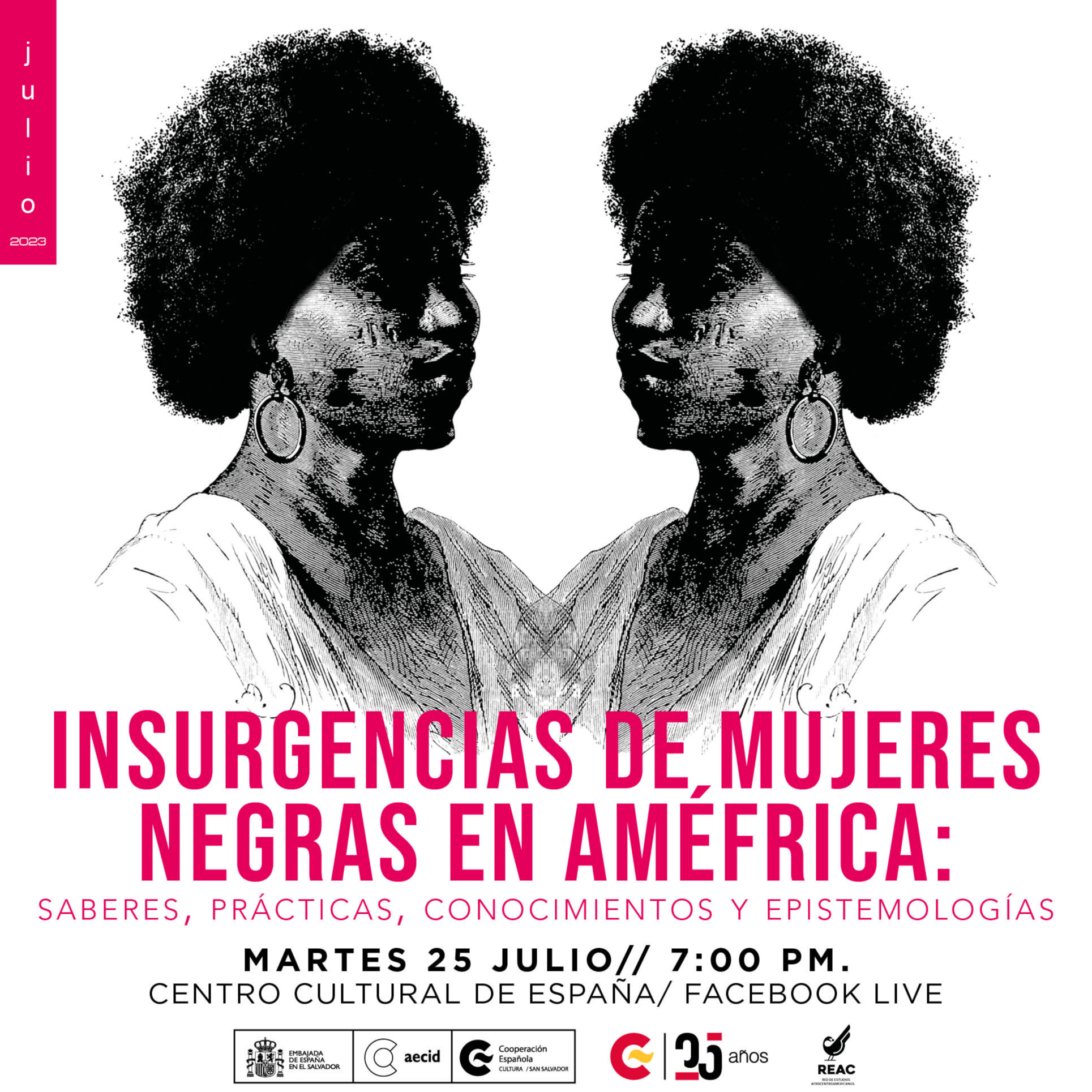 El Centro Cultural de España en El Salvador, celebra el  25 de julio, Día Internacional de la Mujer Afrolatina, Afrocaribeña y de la Diáspora, con el conversatorio Insurgencias de mujeres negras en Améfrica: saberes, prácticas, conocimientos y epistemologías, una sesión para compartir experiencias desde el arte y las expresiones de espiritualidad que dejan en evidencia la importancia y el aporte de las mujeres como pilares esenciales de la transmisión de identidad, cultura y memoria. Esta actividad se realizará en el Centro Cultural de España en El Salvador y de manera virtual a través de su Facebook Live.