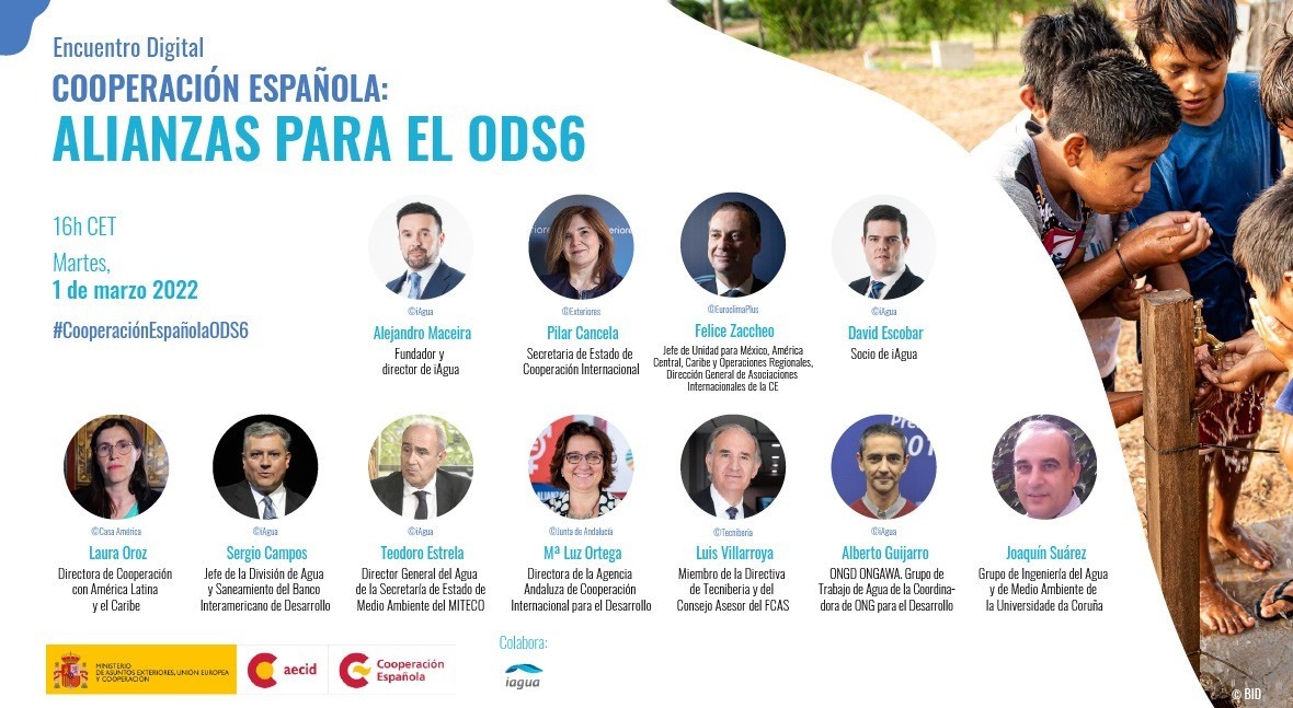 El pasado 1 de marzo, diferentes actores del sector del agua y el saneamiento se dieron cita en el encuentro digital "Cooperación española: Alianzas para el ODS 6". El objetivo era profundizar en el trabajo realizado en torno al ODS 6, con el objetivo de seguir impulsando los derechos humanos al agua y al saneamiento, la gestión integral del recurso hídrico (GIRH) y la gobernanza del agua, prioridades de la Cooperación Española en los países en los que trabaja.