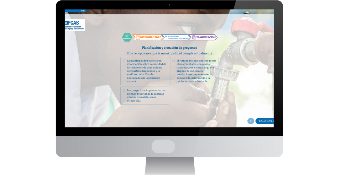 Esta herramienta se divide en dos secciones, una específica para agua y otra para saneamiento, es accesible online y en formato PDF, es gratuita y mantiene el anonimato de quien la utiliza. Al tener un enfoque didáctico es de fácil uso y está pensada para realizarse en talleres participativos, para así potenciar el intercambio de opiniones y poder llegar a resultados consensuados, lo que permite optimizar y mejorar la gobernanza municipal. Quienes la usan reciben, además de sus resultados y explicaciones, una hoja de ruta para avanzar en el cumplimiento de estos derechos humanos.