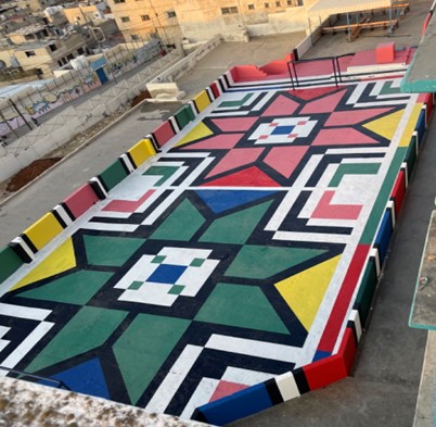 El diseño del mural, pintado en el patio de juego de la escuela, ha estado inspirado por los patrones de la rica tradición del bordado palestino, que supone un testimonio