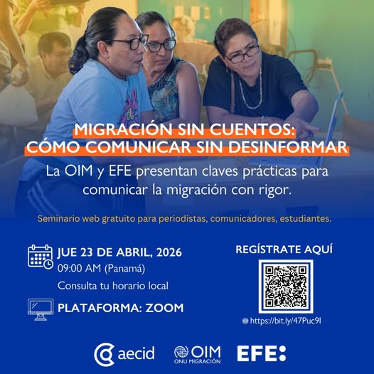 La Organización Internacional para las Migraciones (OIM) y la Agencia EFE organizan el seminario web gratuito “Migración sin cuentos: cómo comunicar sin desinformar”, un espacio para compartir información clave, enfoques y herramientas prácticas que contribuyan a una comunicación más rigurosa, responsable y humana sobre migración. En un contexto marcado por la circulación de desinformación, estereotipos y narrativas imprecisas, este encuentro busca aportar elementos útiles para fortalecer la cobertura periodística y la creación de contenidos sobre migración, desde una perspectiva basada en evidencia. La actividad cuenta con el apoyo de la Agencia Española de Cooperación Internacional para el Desarrollo (AECID). Inscripciones aquí.