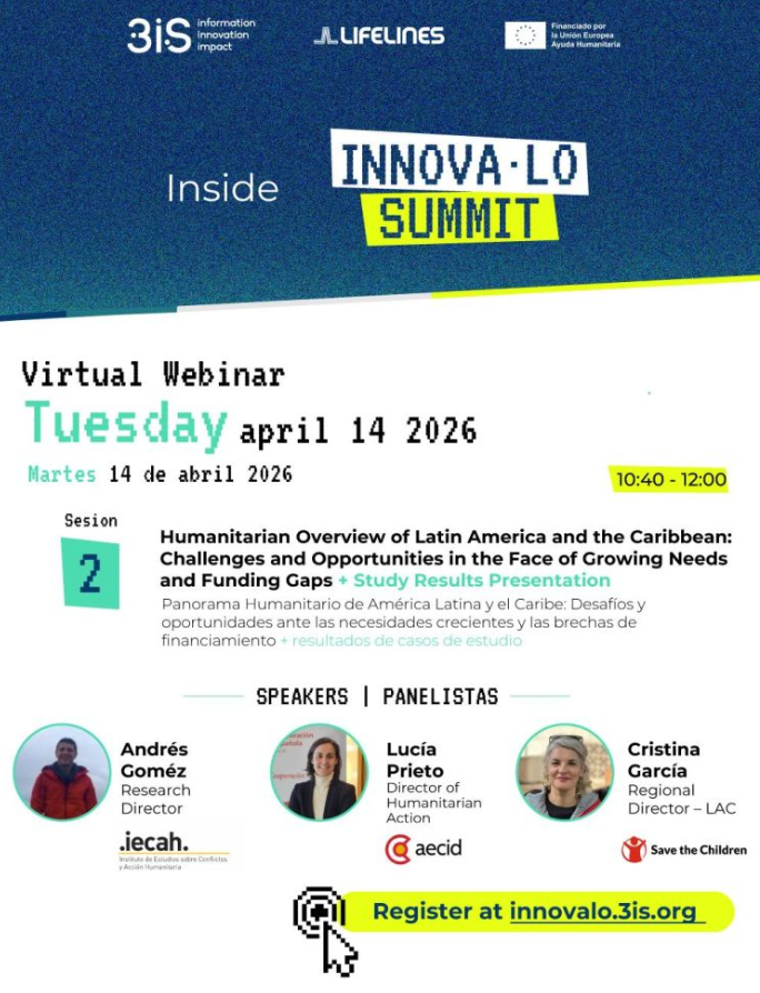 En el marco del #INNOVAlo Summit, el próximo 14 de abril se celebrará un panel de expertos dedicado a analizar el complejo panorama humanitario en América Latina y el Caribe. El encuentro pondrá el foco en el incremento de las necesidades de la población y el reto que suponen las crecientes brechas de financiación para dar una respuesta eficaz en la región. Este espacio de análisis y debate, organizado por el Instituto de Estudios sobre Conflictos y Acción Humanitaria (IECAH), busca profundizar en los desafíos actuales que enfrenta el sector humanitario en el contexto latinoamericano y caribeño. Durante la jornada, se presentará oficialmente el estudio sobre el panorama humanitario en América Latina y el Caribe, un documento clave para comprender las dinámicas de crisis y las posibles soluciones desde la cooperación internacional. El estudio ha sido elaborado con el apoyo de la Agencia Española de Cooperación Internacional para el Desarrollo (AECID). Participantes del panel: Lucía Prieto: Agencia Española de Cooperación Internacional para el Desarrollo (AECID). Cristina García: Save the Children International. Andrés Gómez: Instituto de Estudios sobre Conflictos y Acción Humanitaria (IECAH). El evento se realiza en modalidad online. Inscripción: https://mailchi.mp/3is/registro-virtual
