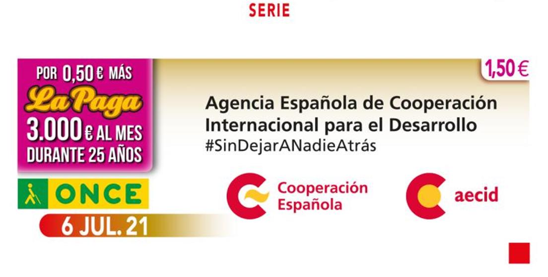 ​La Agencia Española de Cooperación Internacional para el Desarrollo (Aecid) protagonizó el cupón de la ONCE de este martes, 6 de julio. Cinco millones y medio de cupones difundieron la labor de la institución con el lema que comparte con la Agenda mundial 2030 de Desarrollo Sostenible, y que guía el trabajo de la Cooperación Española: ‘Sin dejar a nadie atrás’.