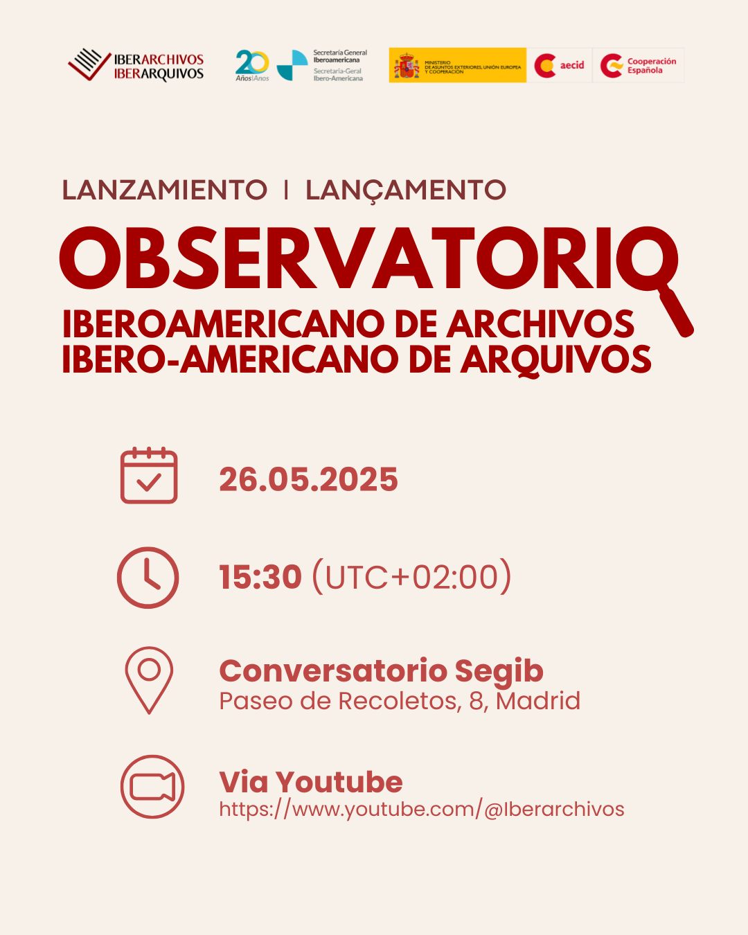 El lunes 26 de mayo se lanza oficialmente el Observatorio Iberoamericano de Archivos, una iniciativa del Programa Iberarchivos, con apoyo de la Agencia Española de Cooperación Internacional para el Desarrollo (AECID), que busca fortalecer la cooperación y mejorar las políticas archivísticas en Iberoamérica.